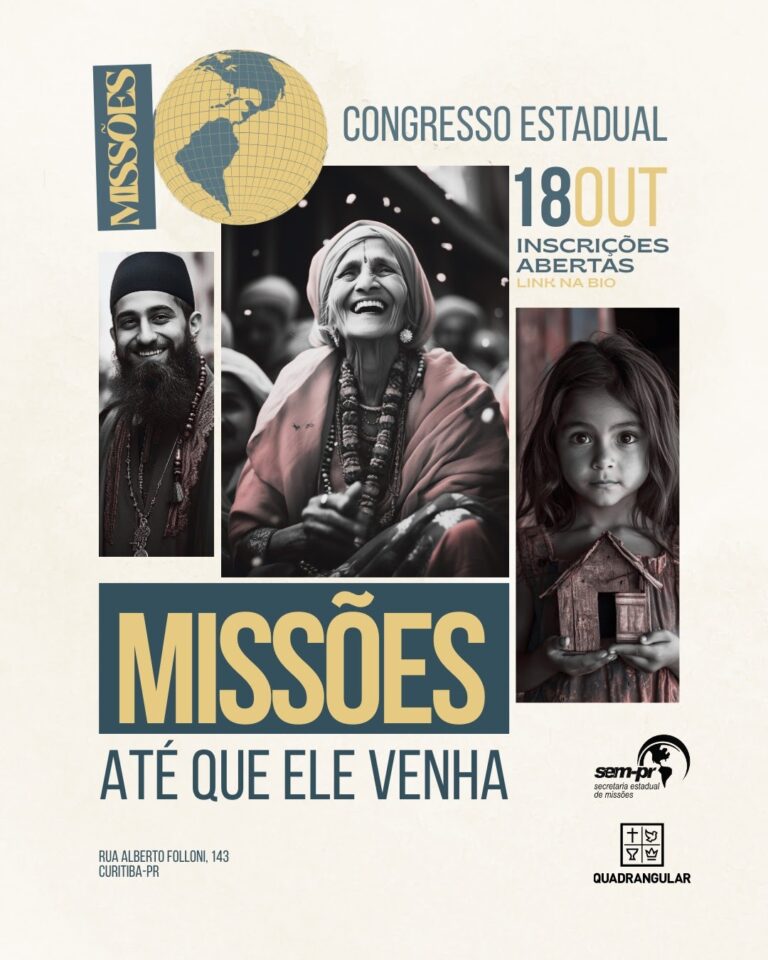 Com o tema “Missões Até que Ele Venha”, o congresso da Primeira Igreja do Evangelho Quadrangular será no dia 18 de outubro, das 9h às 21h, com uma vasta programação e o testemunho de missionários da Espanha. O evento será na sede da igreja em Curitiba, na Rua Alberto Folloni, 143, no bairro Juvevê.